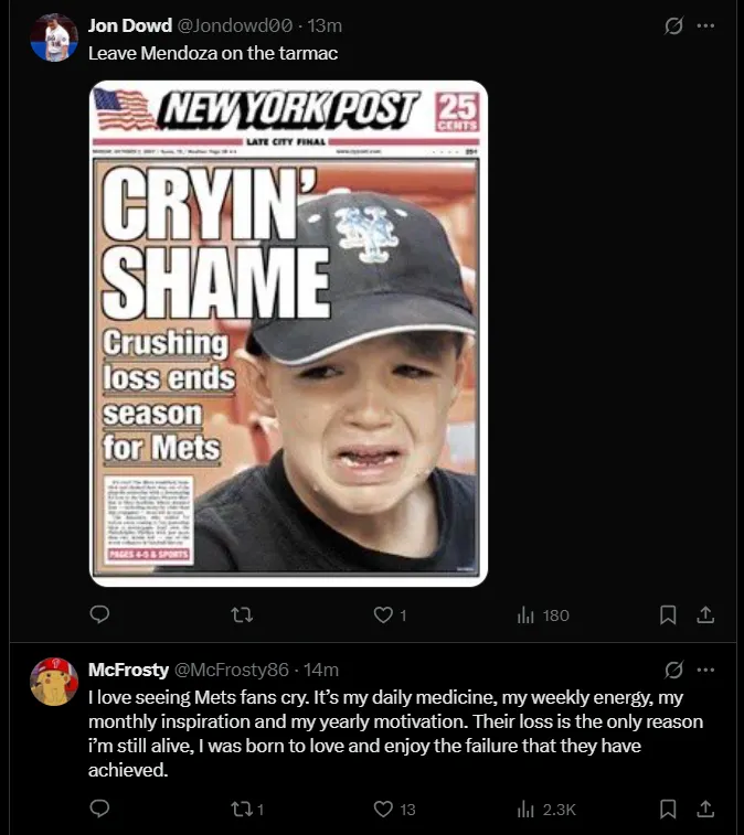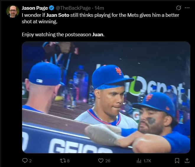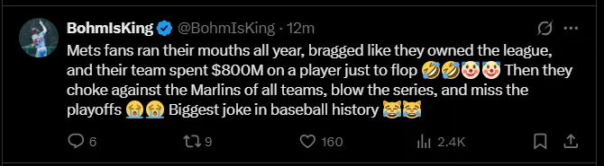 “You guys can clown on the Mets for this embarrassing collapse all you want, but they fought to the very end to try to score a run in that 9th inning against the Marlins. Just fell a lil short. This team is almost there. They just gotta get a guy like Juan Soto this off season.”