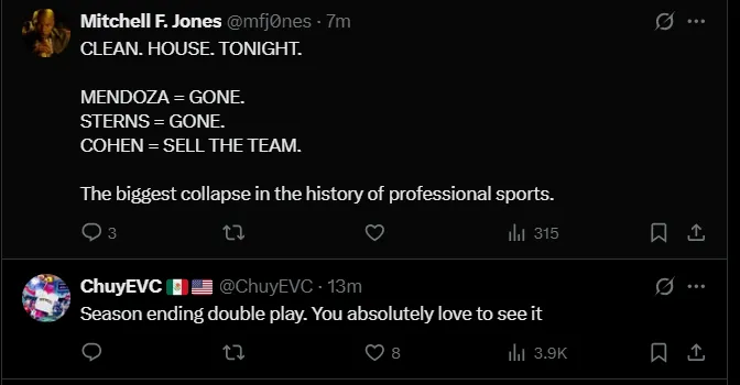 “The New York Mets’ collapse is one of the worst you’ll ever see. Despite being 21 games over .500 in June and owning baseball’s best record at the time, the Mets failed to make the playoffs. Making things worse, no one ‘chased’ them down. They just blew it,” wrote Will Sammon on X.