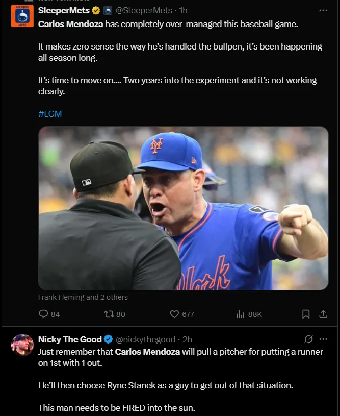 Manager Carlos Mendoza was also a brutal victim of criticism from Mets fans and other baseball lovers, with some calling for his immediate firing. “Carlos Mendoza MUST be fired. Period.” commented Jake Brown of Mets Daily Show and Mets on Sports Illustrated on X.
