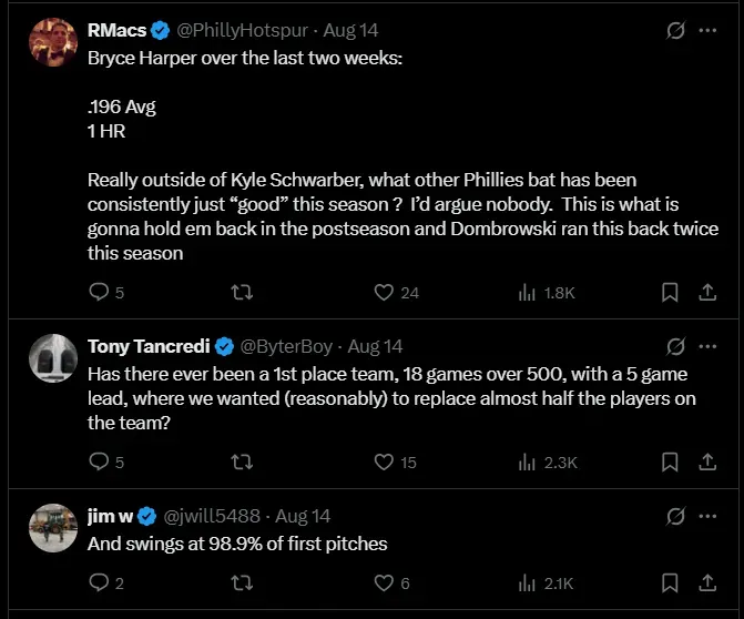 Bryce Harper is a witness to how some of his teammates have struggled to get into a rhythm this year. Offensive production at the plate has been tough for a few players, especially for one Philadelphia Phillies teammate who hasn’t recorded a walk in August.