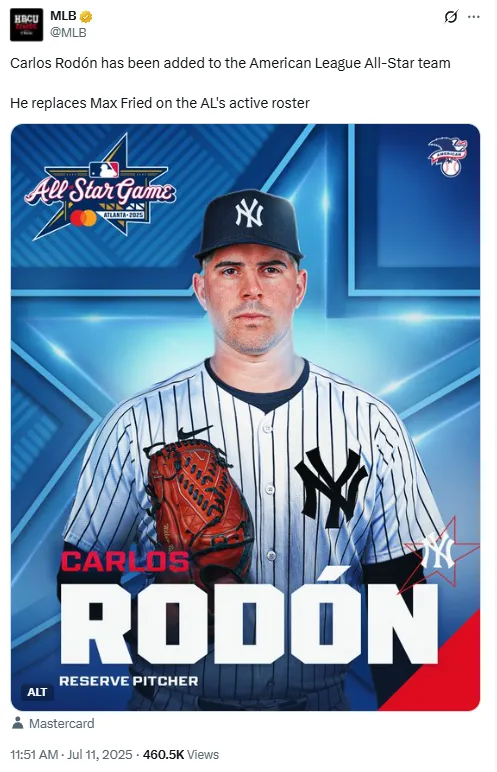 Carlos Rodon wasn’t initially headed to Atlanta, but the Yankees left-hander is now officially part of the American League All-Star roster following a last-minute substitution. The move comes after teammate Max Fried was ruled out, paving the way for Rodon to represent the New York Yankees in the Midsummer Classic.