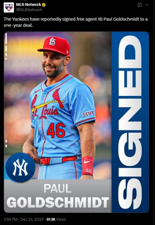 With the departure of Anthony Rizzo, Goldschmidt steps in as the Yankees’ new starting first baseman. The team, which has been highly active in the offseason after missing out on Juan Soto, views Goldschmidt as a vital piece to stabilize the infield and provide leadership for its younger core.