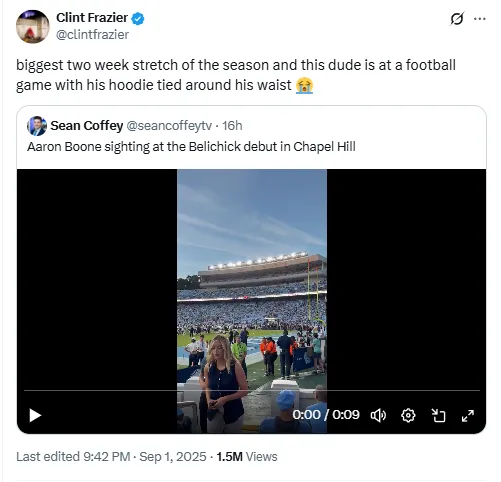 For Boone, the challenge now lies in shifting the conversation back to the Yankees’ playoff push. The manager’s decisions during this critical stretch will matter far more than one night spent in the stands of Kenan Memorial Stadium.