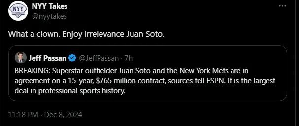 The news of Juan Soto signing with the New York Mets sparked explosive reactions from Yankees fans and other notable figures, with some responses proving difficult to stomach.