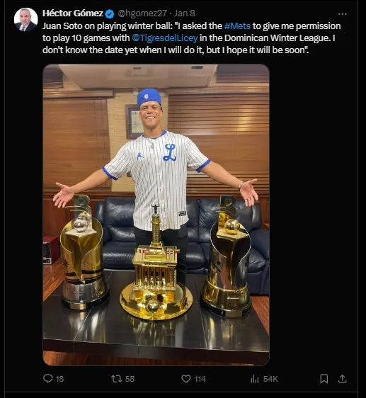 Soto’s request was reportedly well-received by the New York Mets, who have granted him permission to play 10 games with the Tigres del Licey. According to a post by veteran reporter Héctor Gómez, Soto expressed his excitement, stating: