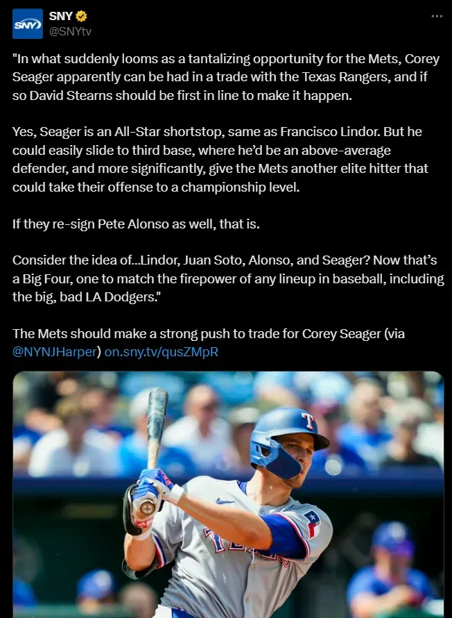 Francisco Lindor could soon find himself at the center of a franchise-altering vision, as John Harper of SNY reports that āCorey Seager apparently can be had in a trade with the Texas Rangers.ā Harper describes the scenario as āa tantalizing opportunity for the Mets,ā one that president of baseball operations David Stearns should aggressively pursue.