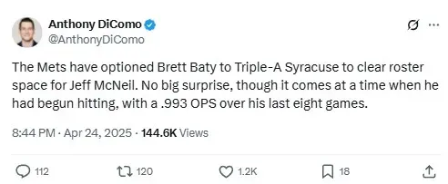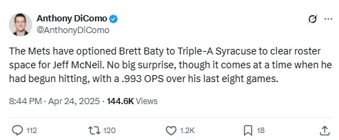 Mets beat reporter Anthony DiComo summarized the situation on X, stating: “The Mets have optioned Brett Baty to Triple-A Syracuse to clear roster space for Jeff McNeil. No big surprise, though it comes at a time when he had begun hitting, with a .993 OPS over his last eight games.”