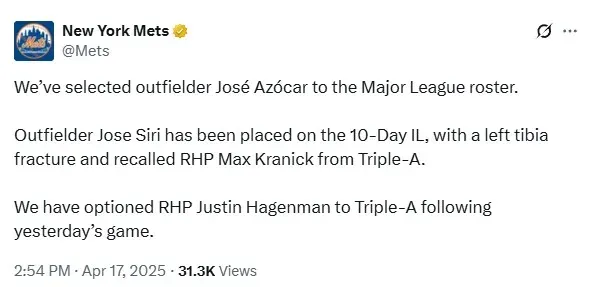 âWeâve selected outfielder JosĂ© AzĂłcar to the Major League roster,â the team announced via its official X account. âOutfielder JosĂ© Siri has been placed on the 10-Day IL with a left tibia fracture, and RHP Max Kranick has been recalled from Triple-A. We have optioned RHP Justin Hagenman to Triple-A following yesterdayâs game.â These moves reflect the clubâs immediate response to Siriâs absence, aiming to reinforce both the outfield and the bullpen.
