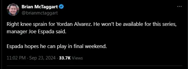 The manager also revealed that he hopes Yordan Alvarez will be back for the Astrosā final weekend of the 2024 MLB season. They will face off against the Cleveland Guardians in a series from September 27 to 29 at Progressive Field to close out the regular season.