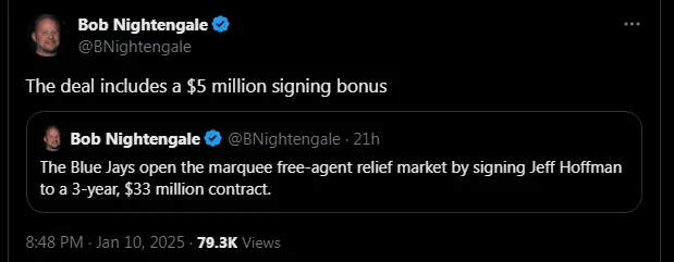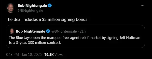 According to reports from Bob Nightengale and other sources, the Blue Jays have signed Jeff Hoffman to a $33 million deal, making it the largest contract for a reliever so far this MLB offseason.