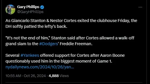 “It’s not the end of him,” Giancarlo Stanton told Gary Phillips about Cortes after the game’s challenging episode, in which Yankees manager Aaron Boone placed him in a tough spot.