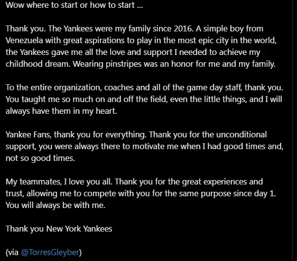 In his message to fans, Torres said: āYankee Fans, thank you for everything. Thank you for the unconditional support, you were always there to motivate me when I had good times and, not so good times.ā