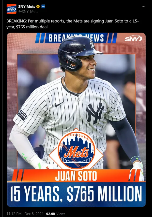 Juan Soto spent the 2024 season with the Yankees, earning a then-career-high salary of $31 million. That figure will now be dwarfed by his historic contract with the New York Mets, where he’s set to earn approximately $20 million more per year. Soto’s new 15-year, $765 million deal is not only the largest in MLB history but also surpasses any contract in professional sports worldwide.