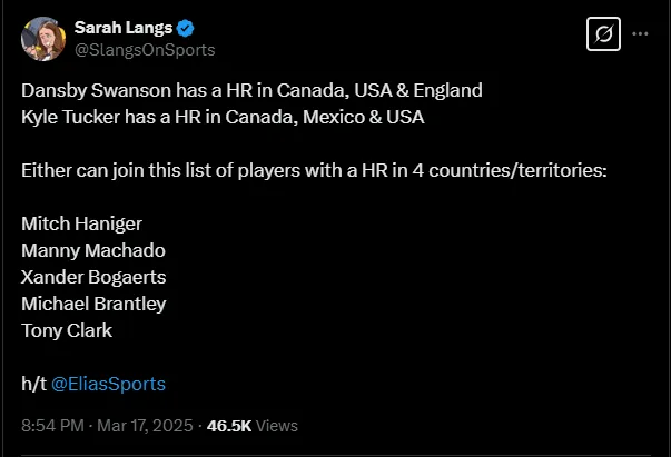 The exclusive club Manny Machado is a part of, which Tucker and his Cubs teammate Dansby Swanson could join, is a short list of MLB players who have hit a home run in four different countries. The stats were compiled and presented by Elias Sports Bureau and Sarah Langs.