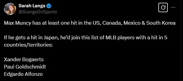 According to stats compiled by Sarah Langs and Elias Sports Bureau, Muncy needs just one hit in Tokyo to become only the fourth player to record a hit in five different countries. He has already collected hits in Canada, Mexico, South Korea, and, of course, the United States.