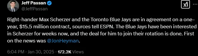 According to Jon Heyman’s initial report, Scherzer will head to Toronto to play for the Blue Jays next season after agreeing to a one-year deal worth $15.5 million. Notably, Scherzer’s salary in Texas was over $40 million per year under a previous massive contract.