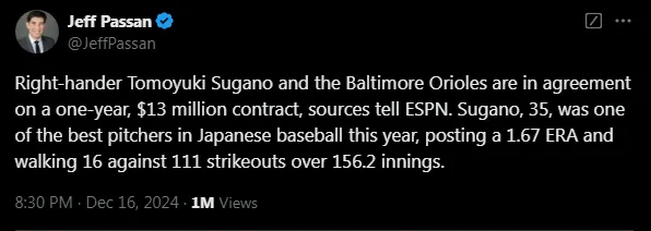 According to Jeff Passan, the Orioles have signed Tomoyuki Sugano to a one-year, $13 million deal. Sugano delivered an impressive 1.67 ERA with 111 strikeouts across 156.2 innings during the 2024 season in Japan. He recently played for the Yomiuri Giants, where he posted a stellar 15-3 record over 24 games.