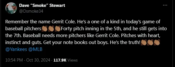 After the Yankees’ championship bid came to an end, Cole received support from teammates and former MLB players alike, including three-time World Series champion Dave “Smoke” Stewart, who won his first title with the Los Angeles Dodgers in 1981.