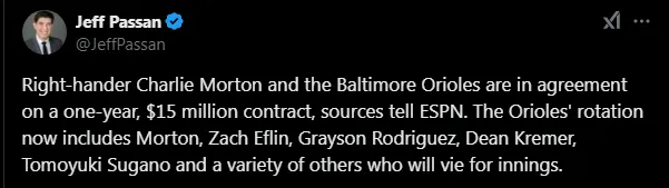 According to Jeff Passan, Morton agreed to a one-year deal with the Orioles worth $15 million. The right-handed pitcher will join the rotation alongside other experienced arms like Zach Eflin, who has been with Baltimore since last season.