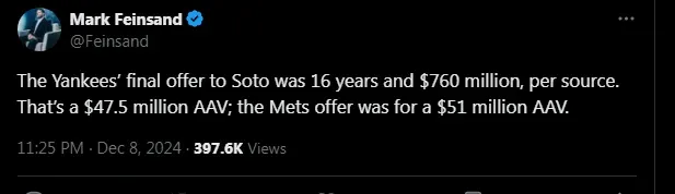 Andy Martino of SNY reported that the Yankees had the leading offer until the afternoon of December 8, when Steve Cohen and the Mets presented their slightly higher bid. The revised offer reportedly swayed Soto’s decision, securing his move to Queens.