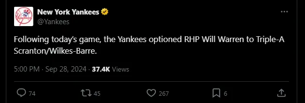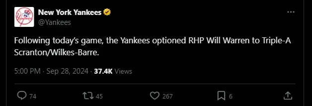 The New York Yankees have optioned right-handed pitcher Will Warren to their Triple-A affiliate, the Scranton/Wilkes-Barre RailRiders, after he struggled to meet expectations during his Major League debut. Warren, 25, finished with a disappointing 0-3 record.
