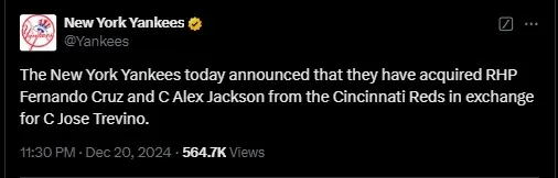 In a surprising MLB trade this past Friday, the New York Yankees bolstered their roster by acquiring reliever Fernando Cruz and catcher Alex Jackson from the Cincinnati Reds in exchange for All-Star catcher José Trevino.