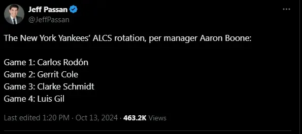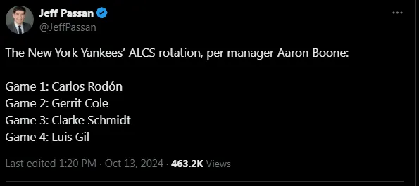 According to Aaron Boone, Yankees manager, the starter for Game 1 will be Carlos Rodon—a decision that took some by surprise, but Boone confirmed it came down to a close choice between Rodon and Clarke Schmidt.