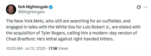 According to Bob Nightengale, via X, âThe New York Mets, who still are searching for an outfielder, and engaged in talks with the White Sox for Luis Robert Jr., are elated with the acquisition of Tyler Rogers, calling him a modern-day version of Chad Bradford. Heâs lethal against right-handed hitters.â