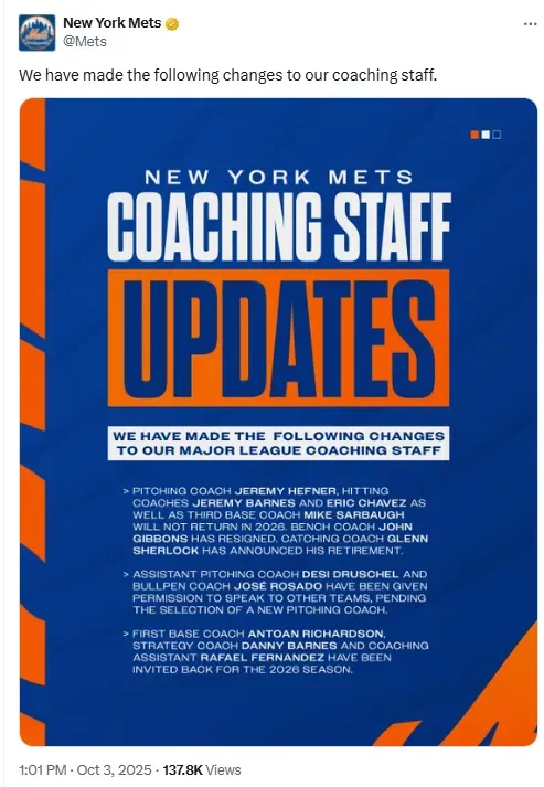 Among the most notable departures are pitching coach Jeremy Hefner and hitting coach Eric Chavez, both of whom will not return for the 2026 campaign. The shakeup didn’t stop there, as the Mets also confirmed that assistant hitting coach Jeremy Barnes won’t be back.