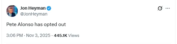 Free agency opens Thursday at 5 p.m. ET, giving the Mets a chance to try to bring him back. Alonso’s decision to opt out signals that he’s ready to explore his market value, but a return to New York remains possible if the right offer is on the table.