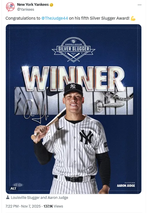 Judge’s historic season was formally recognized on Friday, when Louisville Slugger announced him as a Silver Slugger Award winner for the fifth time in his career. The Yankees quickly shared the news on social media, writing, Congratulations to @TheJudge44 on his fifth Silver Slugger Award! 💪”