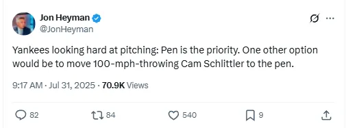 Veteran MLB insider Jon Heyman recently revealed, “Yankees looking hard at pitching: Pen is the priority. One other option would be to move 100-mph-throwing Cam Schlittler to the pen.” This statement clearly outlines the Yankees’ dual approach of pursuing external trade targets while considering internal options.