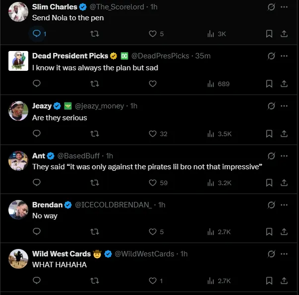 Almost immediately, X (formerly Twitter) lit up. One fan simply posted, “NOOOO.” Another, recalling Abel’s performance, quipped sarcastically, “Imagine tying an 80‑year franchise record and they reward you with a demotion. I love this team!”—a nod to Abel matching Curt Simmons’ nine‑strikeout mark.