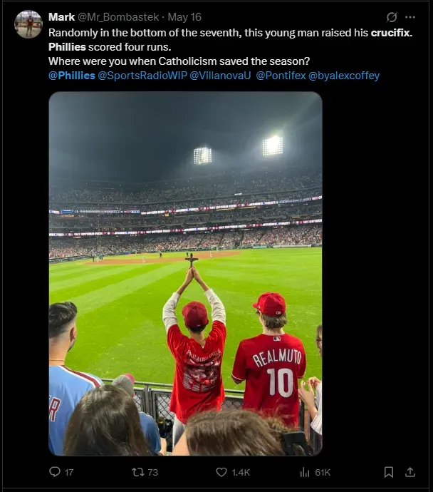 The crucifix moment came during the opening game of a series against the Pirates at Citizens Bank Park. An unidentified fan in the outfield raised a crucifix with both hands, and the Phillies responded by erupting for seven runs to come back from a 3-1 deficit and win 8-4.