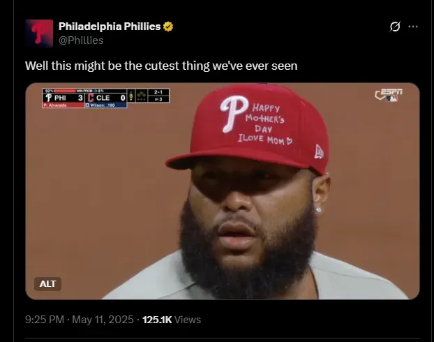 Pitcher Jose Alvarado took the mound wearing a Phillies cap marked with a handwritten message that read, “Happy Mother’s Day, I Love Mom.” The note, written in white ink, wasn’t stitched or printed—it was personally written on the cap and clearly visible during TV coverage of the game.