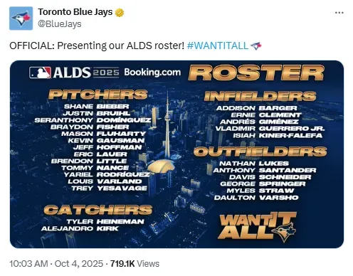 With Bichette sidelined, the Blue Jays’ strategy may shift toward utilizing their bullpen more heavily. Veteran pitchers like Max Scherzer and Chris Bassitt were also left off the roster, leaving room for a bullpen-day approach similar to what Toronto successfully employed late in the regular season.