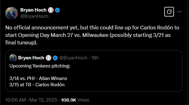 While no official announcement has been made, a report from Bryan Hoch points to Carlos Rodón as the likely starter for the Yankees’ March 27 matchup against the Brewers, which will be their season opener. That series will take place at Yankee Stadium.