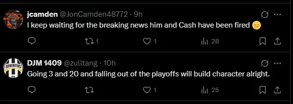 “The ‘It’s a tough stretch’ excuse is over. They are a very flawed team. They should consider selling off parts. They aren’t going to win anyway, and selling the fan base on anything other is disingenuous,” wrote Dean Haigh on X.