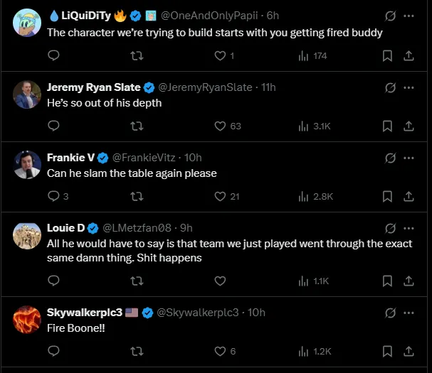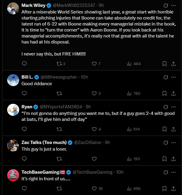 The reaction was swift and harsh. Some fans called for the manager to be fired, while others mocked him with sarcastic takes. “The Yankees need to extend Aaron Boone’s contract so the team can have more stability,” wrote Bill Simmons.