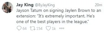 Jayson Tatum responded to a question about Jaylen Brownās contract extension with the Boston Celtics saying that āItās extremely important. Heās one of the best players in the league.ā
