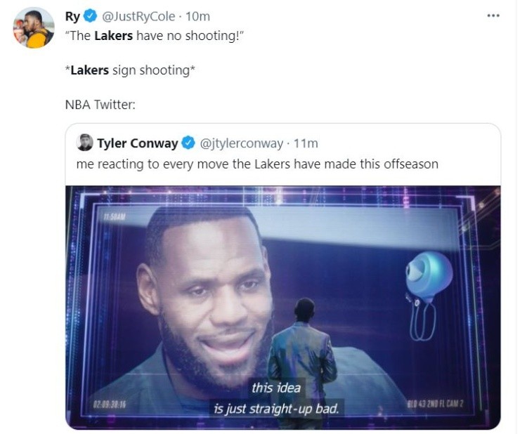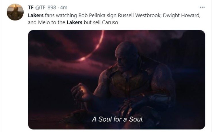 Still, their roster might looktooveteran right now.Carmelo (37), LeBron James (36), Marc Gasol (36), Trevor Ariza (36), Dwight Howard (35), Wayne Ellington (33), Russell Westbrook (32), and Kent Bazemore (32) aren’t getting any younger, but their talent is undeniable and all together could make a good unit. However, each fans has had its say and expressed it with creative memes.