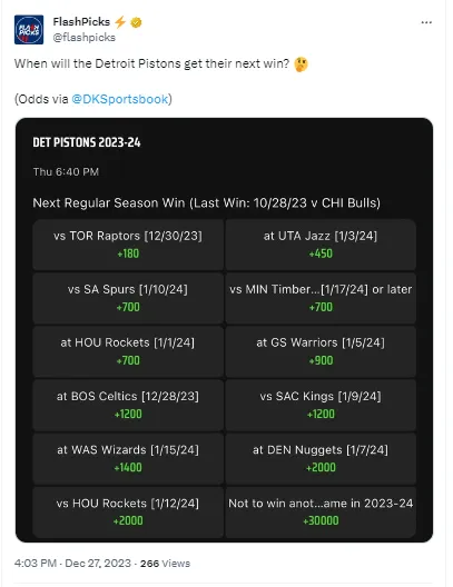 The losing streak began on October 30th and has continued to the last week of the year. Many oddsmakers have already put out odds as to when the Pistons will win their next game, with that victory paying as high as +2000 if it occurs in the second week of January.