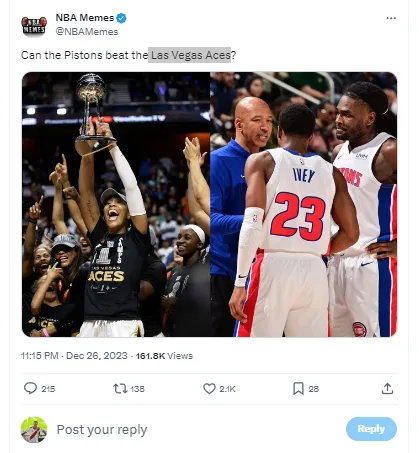 On X, things have been taken to the side of comedy as Pistons fans are trying to see the brighter side of 27 games without a win. NBA Memes tweeted a picture of the WNBA champions and asked the question if the Pistons can beat the Las Vegas Aces.
