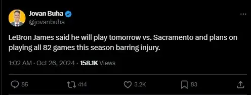āLeBron James said he will play tomorrow vs. Sacramento and plans on playing all 82 games this season barring injury,ā Lakers beat reporter Jovan Buha of The Athletic has reported.