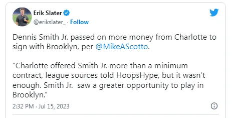According to Erik Slater and Mike Scotto, the player who recently left the Charlotte Hornets was Dennis Smith Jr. According to reports, he would have accepted less money to play for the Brooklyn Nets. But it’s not about the money Smith Jr. aspires to play more minutes with the Nets, something that he couldn’t do in Charlotte.