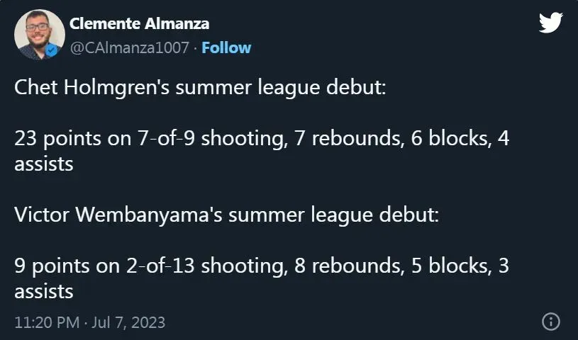 Based on the stats during the debut of both players, Holmgren and Wembanyama, during the 2023 Summer League, Chet was better with 23 points scored, 7/9 Field goals, 7 rebounds, 6 blocks and 4 assists. On the other hand, Wembanyama posted 9 points, 2/13 field goals, 8 rebounds, 5 blocks and 3 assists.