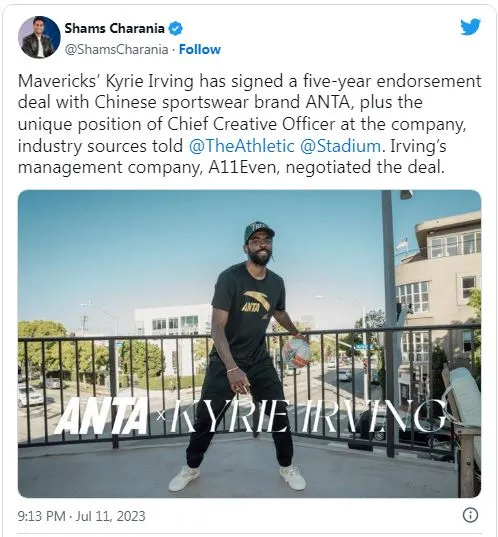 According to Shams Charania, the player who recently signed an endorsement deal with the Chinese sportswear company ANTA is Kyrie Irving. The amount of the contract is not yet known, but Irving’s management company is expected to release all the details of the deal soon.