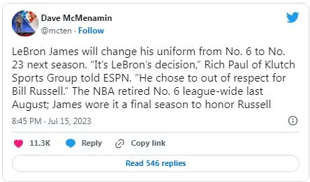 According to McMenamin and Klutch Sports for ESPN, LeBron James will leave behind his current No. 6 and during the upcoming 2023-2024 season he will wear the iconic No. 23. That will be the last time he will wear No. 6 again.