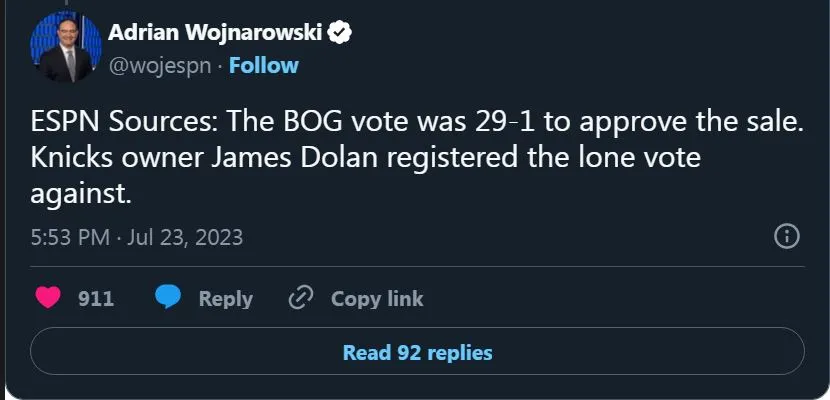 The board of governors approved the sale of the franchise 29-1, with James Dolan, owner of the New York Knicks, being the lone dissenting vote. Dolan’s vote against the sale was apparently symbolic, as it did not change the outcome of the vote.