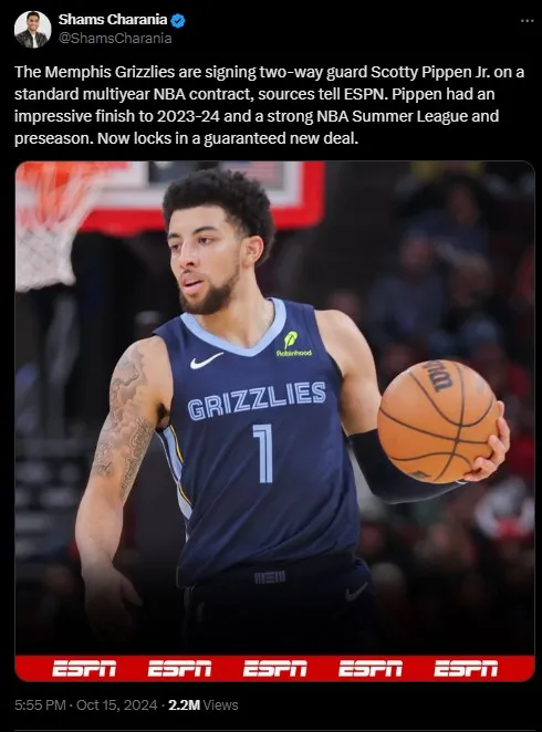 Guard Scottie Pippen Jr., son of NBA Hall of Famer Scottie Pippen, has been signed by the Memphis Grizzlies to a standard multiyear contract, according to a report by Shams Charania.